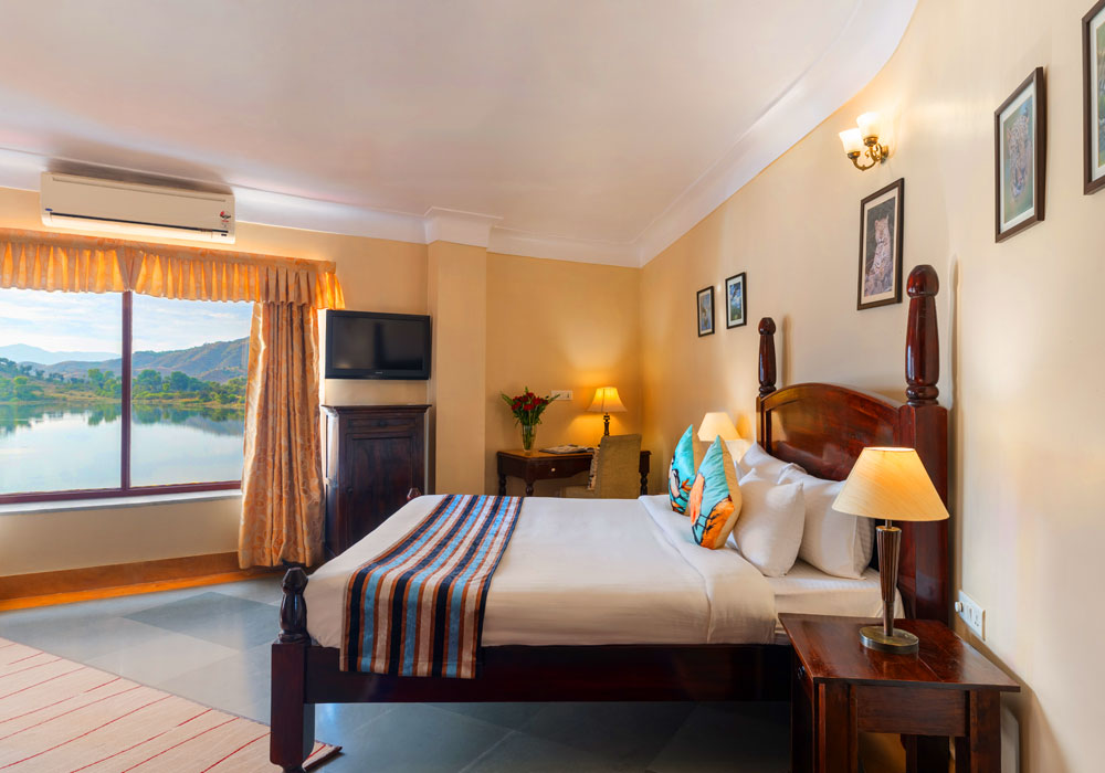 Rustically dressed deluxe suites with beautifully appointed modern amenities like western style bathrooms, a lake facing lounging balcony. Every bathroom has a family splash tub overlooking the lake.